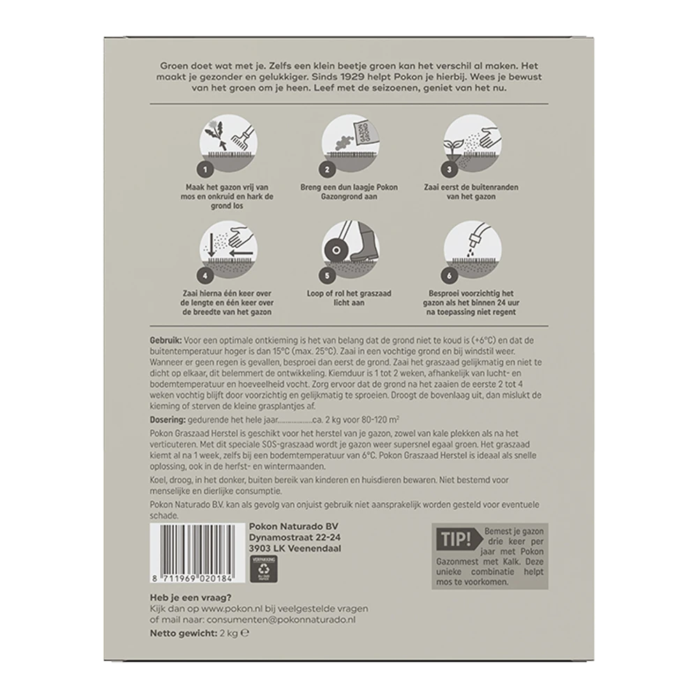 Pokon Graszaad Herstel is geschikt voor het herstel van je gazon, zowel van kale plekken als na het verticuteren. Met dit speciale SOS-graszaad wordt je gazon weer supersnel egaal groen. Het graszaad kiemt al na 1 week, zelfs bij een bodemtemperatuur van 6°C. Pokon Graszaad Herstel is ideaal als snelle oplossing, ook in de herfst- en wintermaanden. Voor een optimale ontkieming is het van belang dat de grond niet te koud is (+6°C.) en dat de buitentemperatuur hoger is dag 15°C (max 25°C). Zaai in een vochtige grond en bij windstil weer. Wanneer er geen regen is gevallen, besproei dan eerst de grond. Zaai het graszaad gelijkmatig en niet te dicht op elkaar, dit belemmert de ontwikkeling. Kiemduur is 1 tot 2 weken, afhankelijk van lucht- en bodemtemperatuur en hoeveelheid vocht. Zorg ervoor dat de grond na het zaaien de eerste 2 tot 4 weken vochtig blijft door voorzichtig en gelijkmatig te sproeien. Droogt de bovenlaag uit, dan mislukt de kieming of sterven de kleine grasplantjes af.